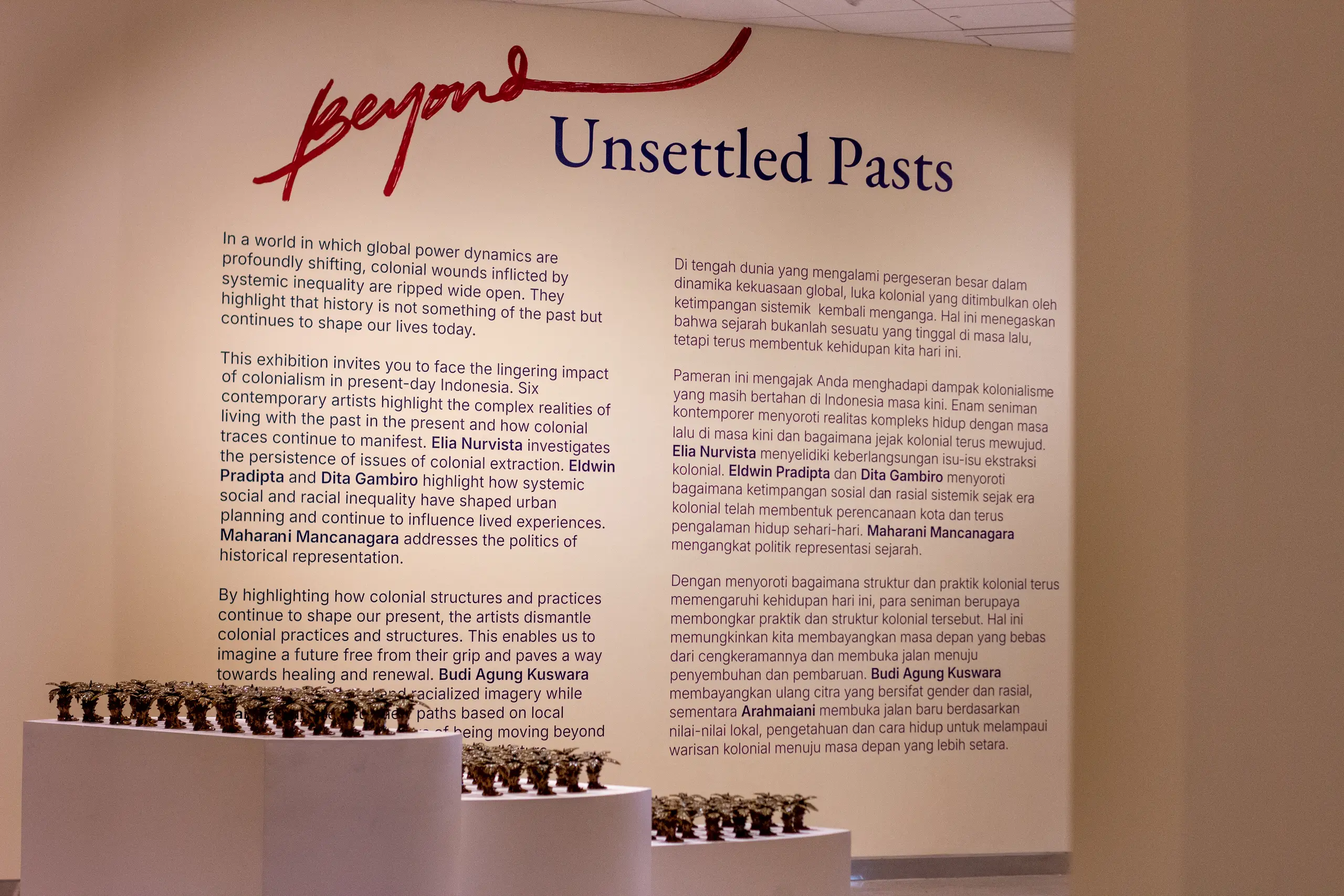 Curated by Dr. Sadiah Boonstra and Sukiato Khurniawan, Beyond Unsettled Pasts invites visitors to confront the lingering effects of colonialism in present-day Indonesia. Powerful artworks by Arahmaiani, Budi Agung Kuswara, Dita Gambiro, Eldwin Pradipta, Elia Nurvista, and Maharani Mancanagara highlight the complex realities of living with the past in the present and how colonial traces continue to manifest. The exhibition delves into issues ranging from colonial extraction, social and racial inequality and gendered and racialized imagery to opening new paths based on local values, knowledge, and ways of being to move beyond colonial legacies.